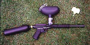 een munitiebox met honderd verfkogels. Dit wapen schiet tot ongeveer 40 meter nauwkeurig, waardoor