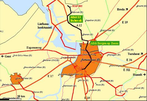 op Zoom neemt. U rijdt dan op de A12 havenweg. Blijf deze volgen tot u AFRIT 13 (groen bord, geel opschrift)